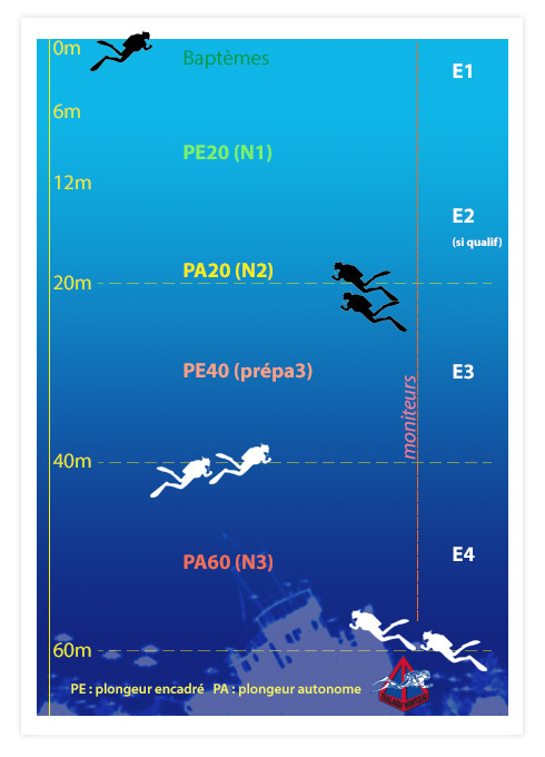 Le club, affilié à la FFESSM, et ayant la chance d’avoir en son sein des cadres diplômés, peut proposer aux adhérents la possibilité de les préparer et leur faire passer les examens et épreuves des différents niveaux de plongée.